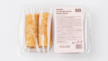 Ассорти из нежных блинчиков с уютными домашними начинками. В порции 4 штуки, по 2 каждого вида. Блины с кусочками яблок отличаются задорной кислинкой, а творожные — воздушным ароматом ванили. Готовим с заботой, используя свежие фрукты и натуральный 9%-ный творог, — без консервантов и искусственных ароматизаторов.