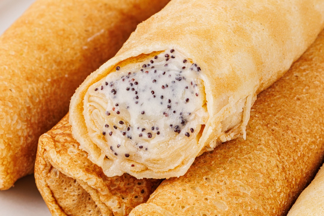 Желанный завтрак для любителей маковой выпечки. Тонкие блинчики на молоке, внутри которых много мака с нежным заварным кремом. Блины могут храниться в морозилке до полугода, оставаясь такими же вкусными.