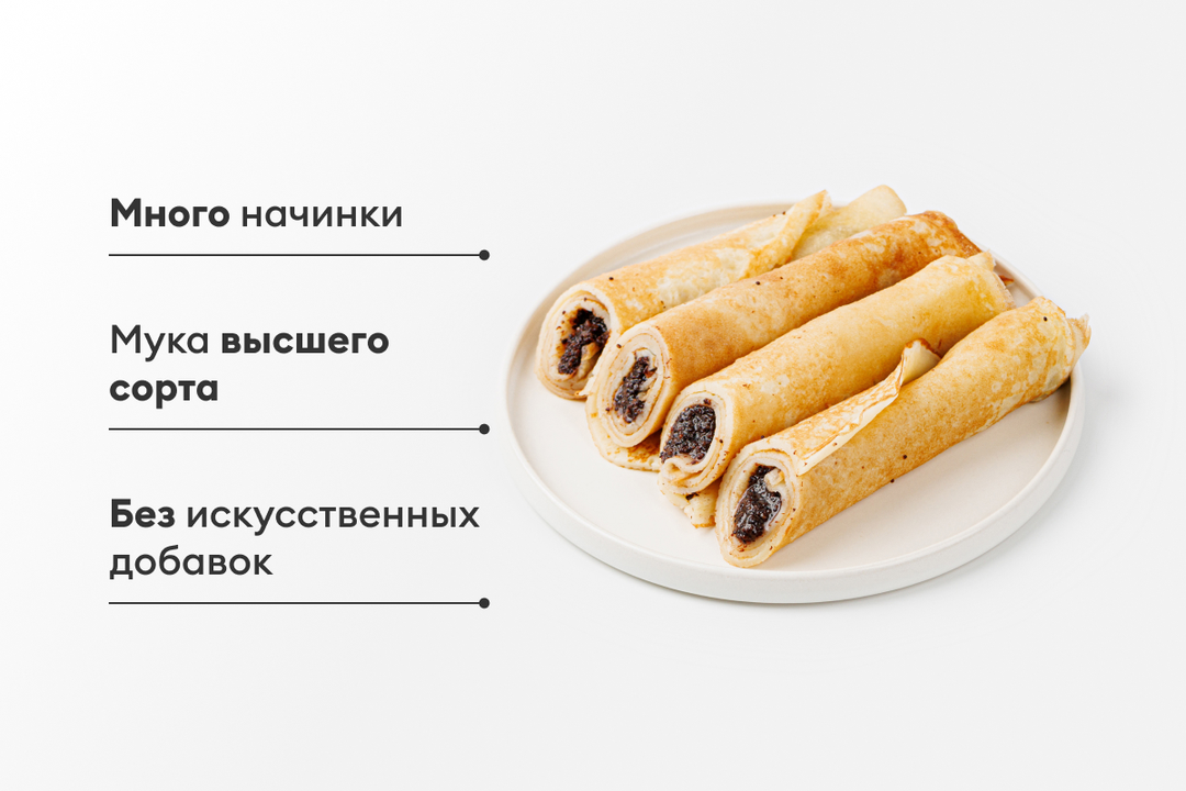 Тоненькие блинчики с маком и сгущённым молоком. Состав проверен: нет усилителей вкуса, консервантов и искусственных ароматизаторов