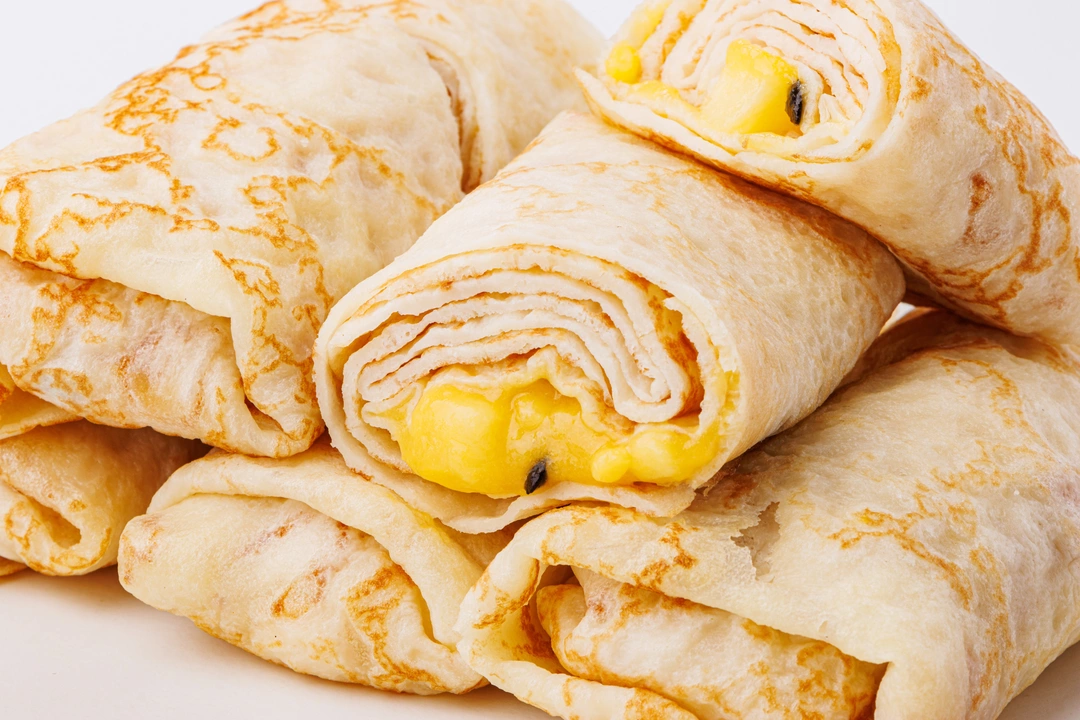 Тонкие золотистые блины с яркой фруктовой начинкой. Внутри — кусочки манго и ароматная маракуйя, которые дают сладость с лёгкой кислинкой и делают вкус выразительным. Тесто на молоке и яйце получается мягким и эластичным, оно хорошо удерживает сочную начинку. В составе нет искусственных ароматизаторов — только натуральные фрукты и простые ингредиенты. Для подачи можно добавить йогурт, сметану или немного мёда, чтобы подчеркнуть тропический вкус.