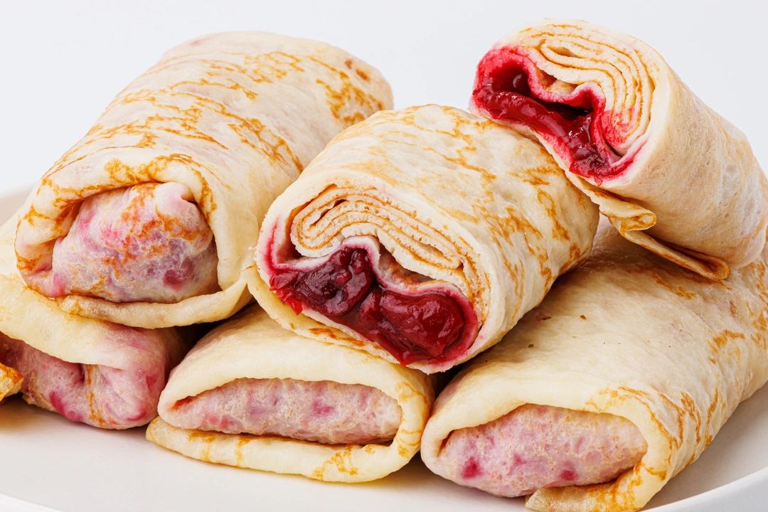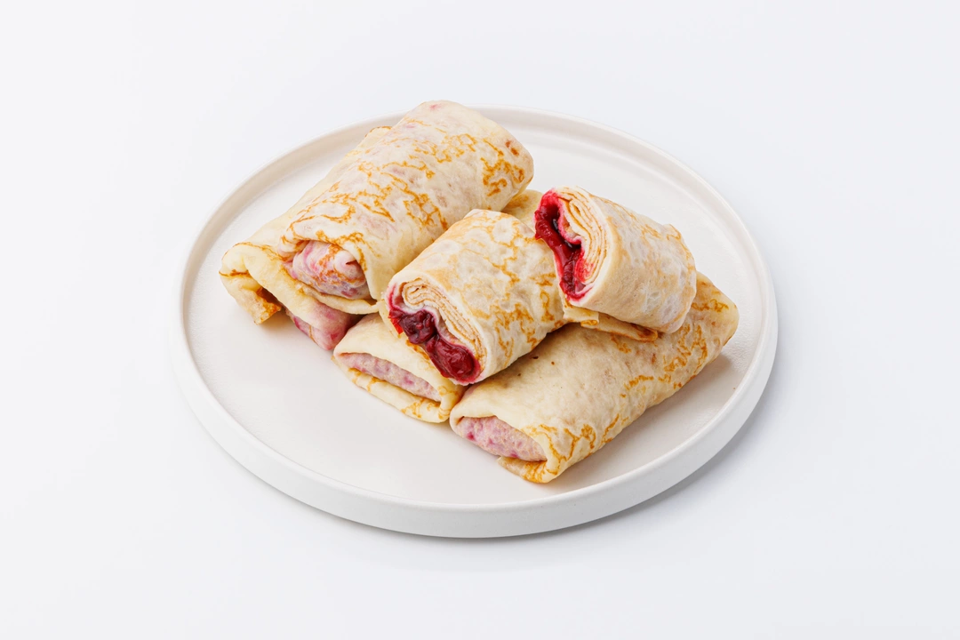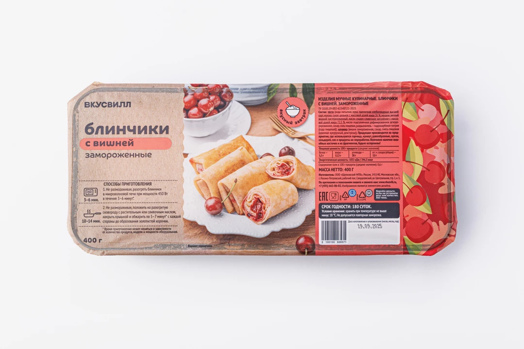 Тонкие блинчики аккуратно свёрнуты и щедро наполнены сочной вишнёвой начинкой. Ягоды сохраняют яркую кислинку, которая в сочетании с нежным тестом создаёт гармоничный вкус. Такие блинчики удобно подать к чаю или кофе, они подойдут и для быстрого завтрака, и для сладкого перекуса. В составе нет искусственных ароматизаторов — вкус полностью основан на натуральных ингредиентах.