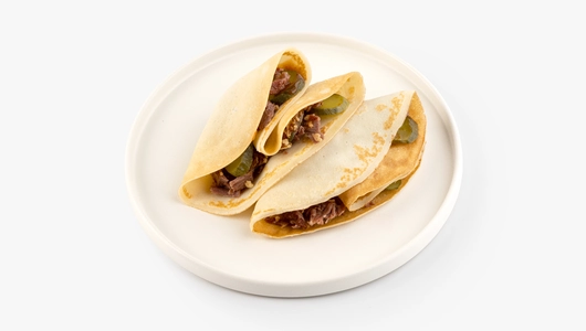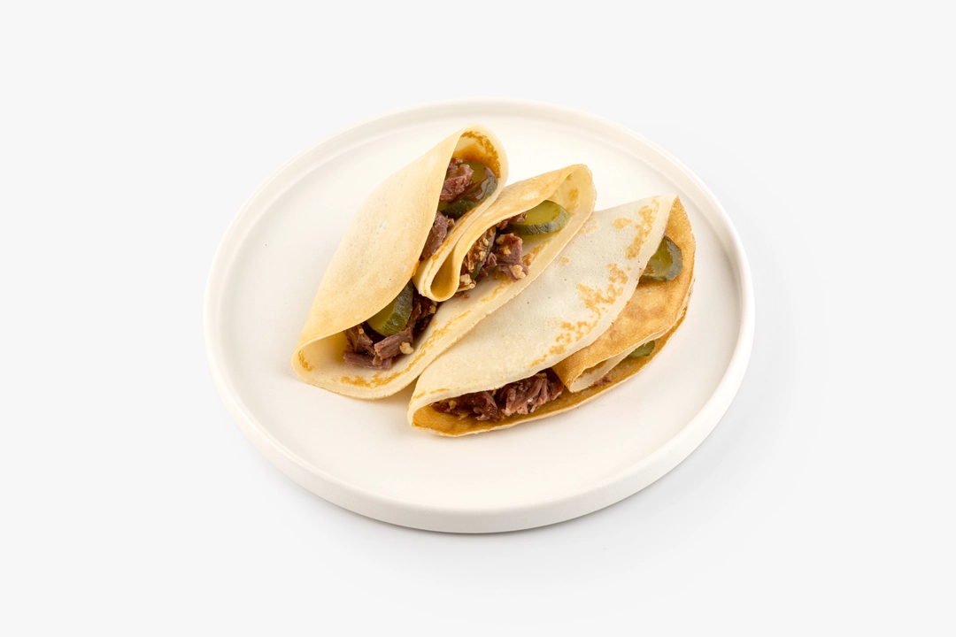 Блины "Богатырский пир" с щёчками, жареным луком и соусом Барбекю, кафе