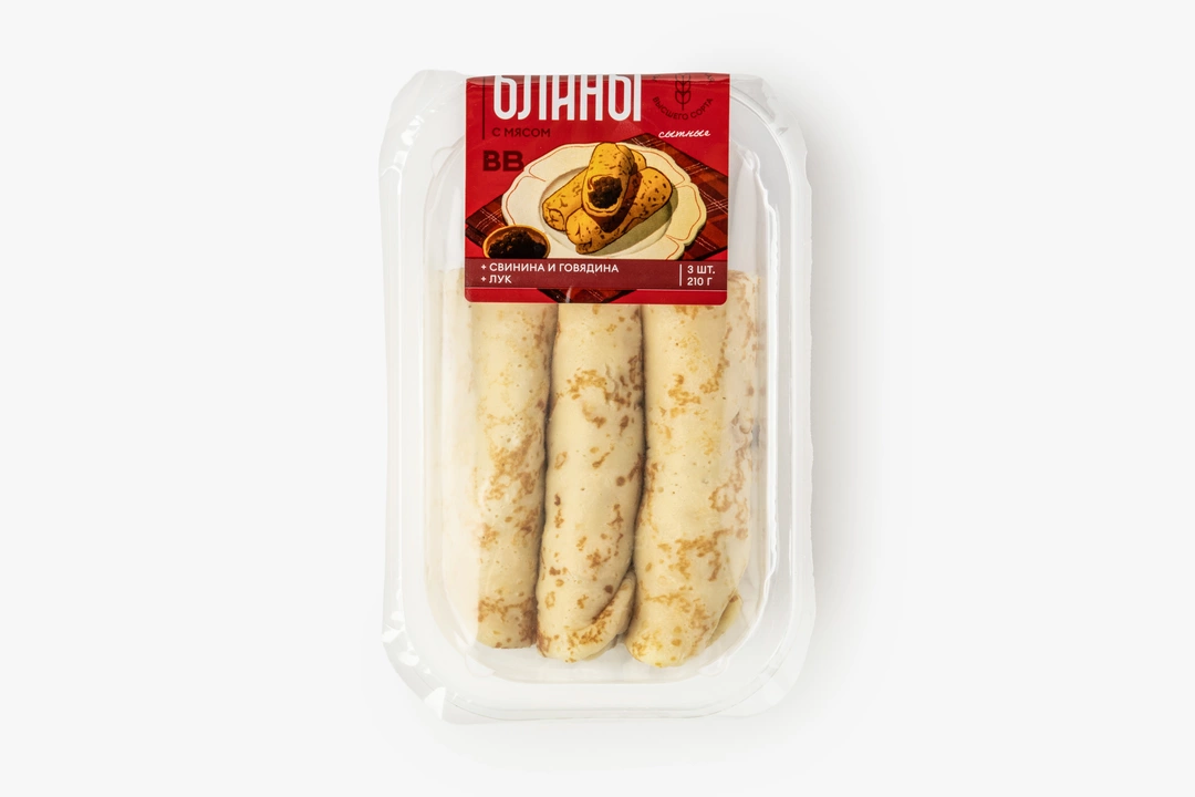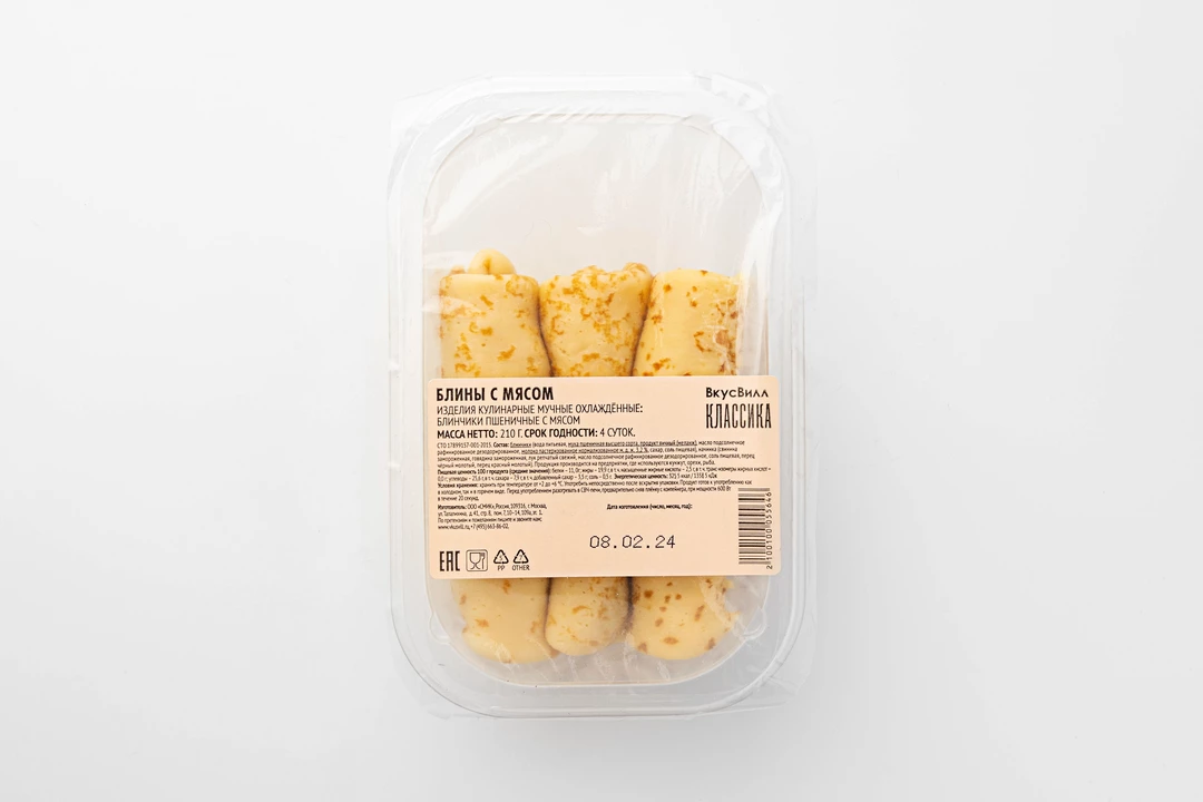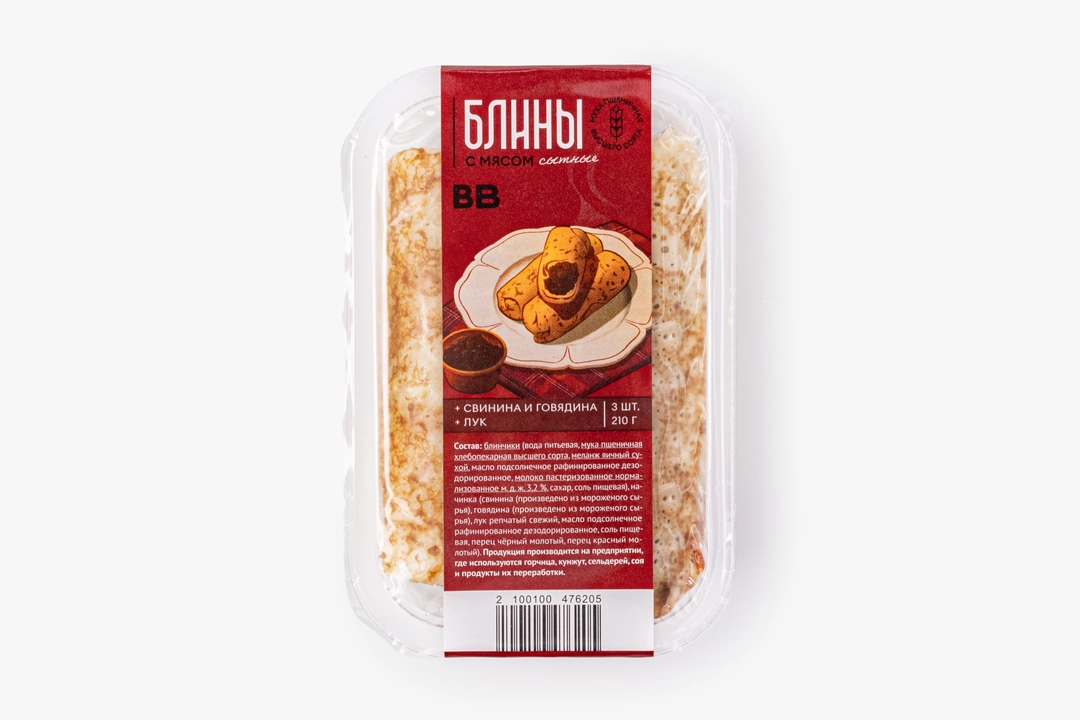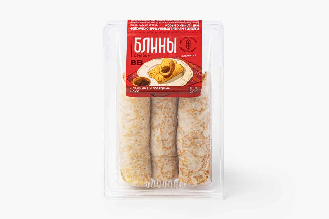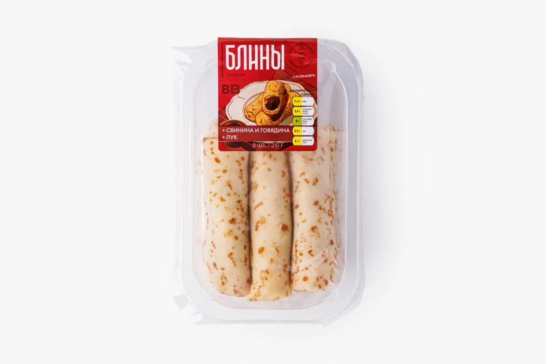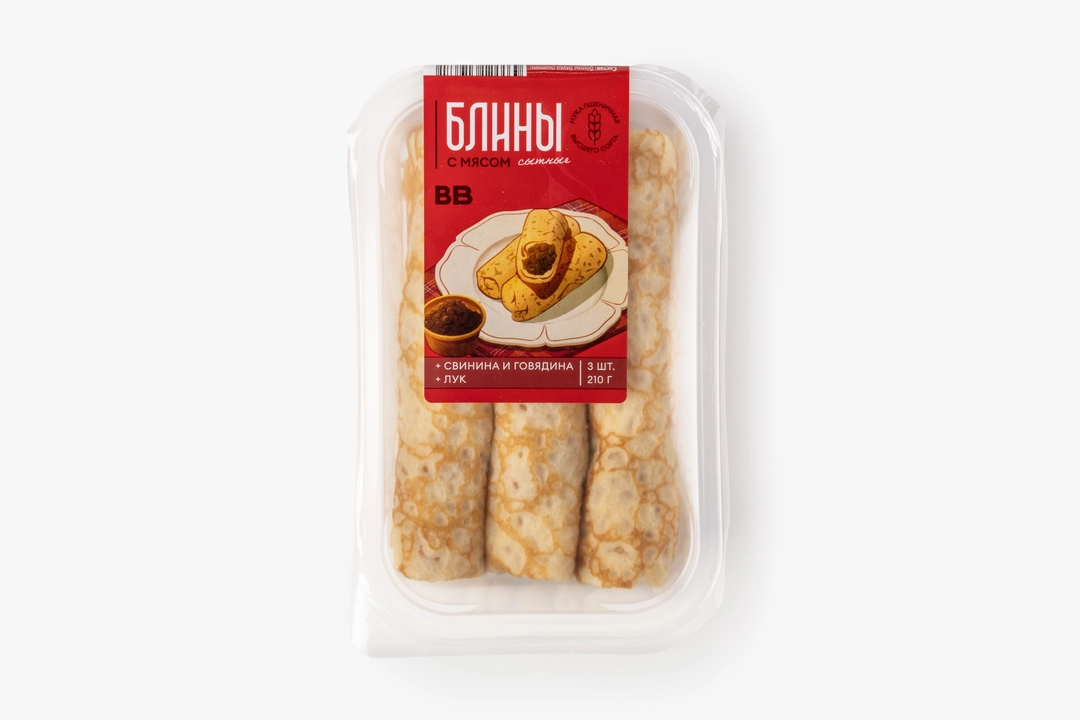 Домашнее блюдо с начинкой из говяжьего и свиного фарша высокого качества. Из мяса удаляются жилки и хрящики, поэтому блинчики придутся по вкусу даже детям. Быстрый сытный вариант для завтрака. Небольшую упаковку удобно брать с собой для перекуса в дороге. Количество блинов - 3 шт.