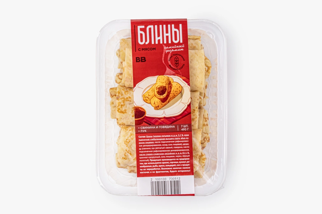 Домашнее блюдо с начинкой из говяжьего и свиного фарша высокого качества. Из мяса удаляются жилки и хрящики, поэтому блинчики придутся по вкусу даже детям. Быстрый и сытный вариант для завтрака. А упаковки семейного формата хватит минимум на двоих. Блины готовы к употреблению.