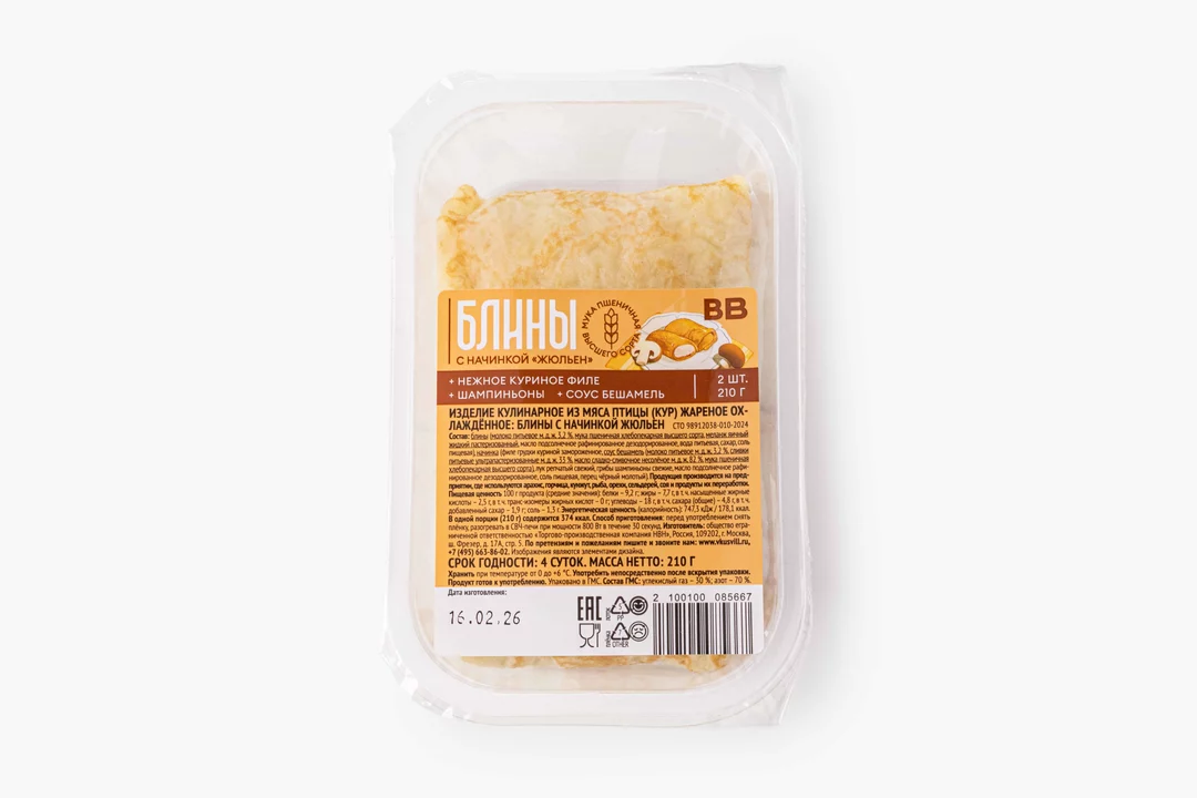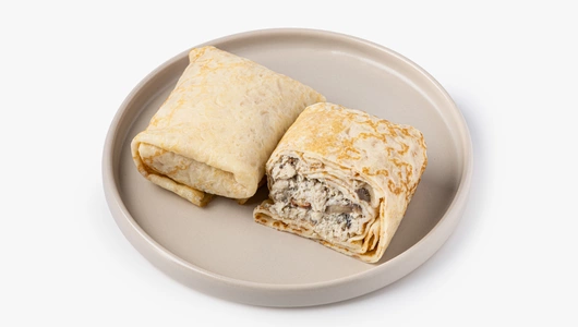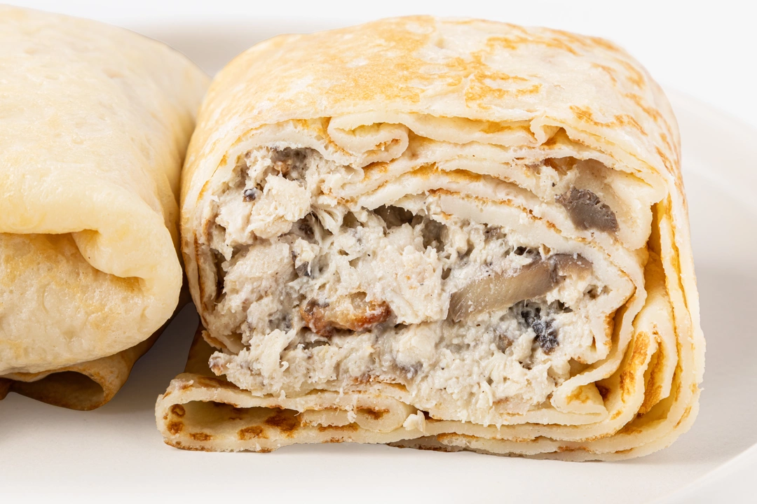 Кусочки нежного куриного филе с обжаренными шампиньонами под соусом «Бешамель», завёрнутые в тонкий домашний блинчик. Необычная подача жюльена в блинных мешочках особенно понравится маленьким гурманам. Такие блинчики не только послужат сытным обедом или перекусом, но и прекрасно подойдут для подачи к праздничному столу.