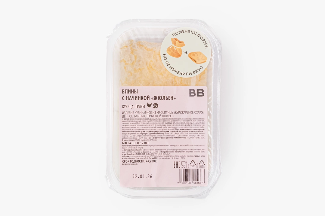 У блинов теперь другая форма — вместо мешочков делаем аккуратные конвертики. Так их удобнее есть и подавать, а начинка распределяется ровнее. Вкус и рецепт остались прежними.