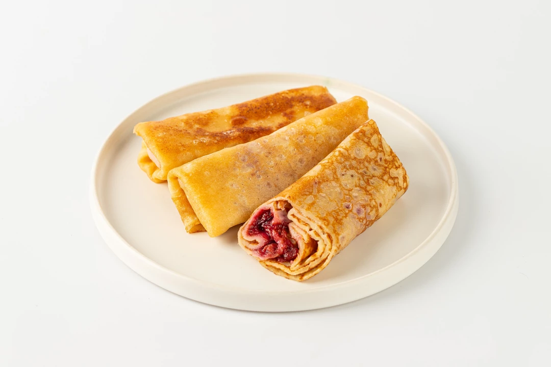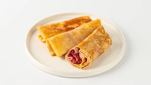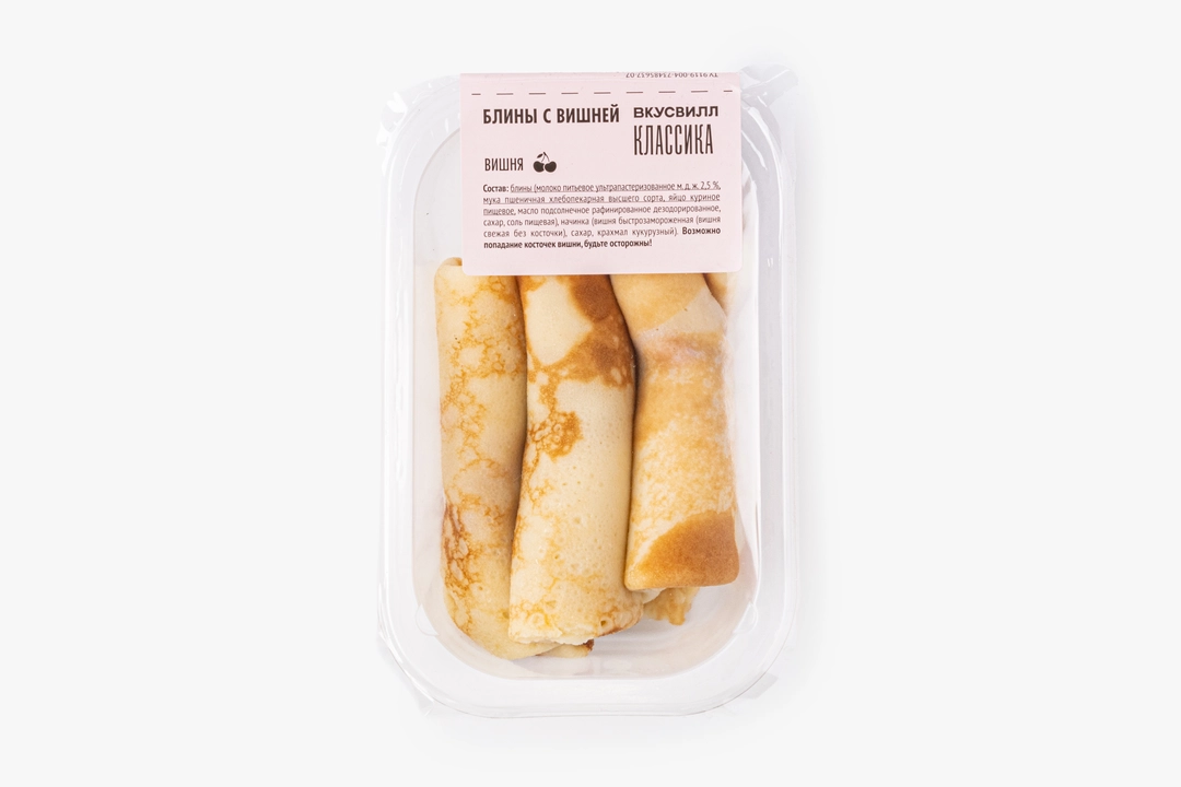 Для блинного теста используем муку высшего сорта. А для начинки — быстрозамороженную вишню без косточек. Состав проверен: нет усилителей вкуса и консервантов