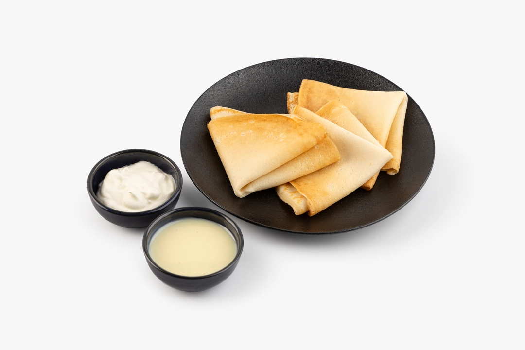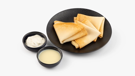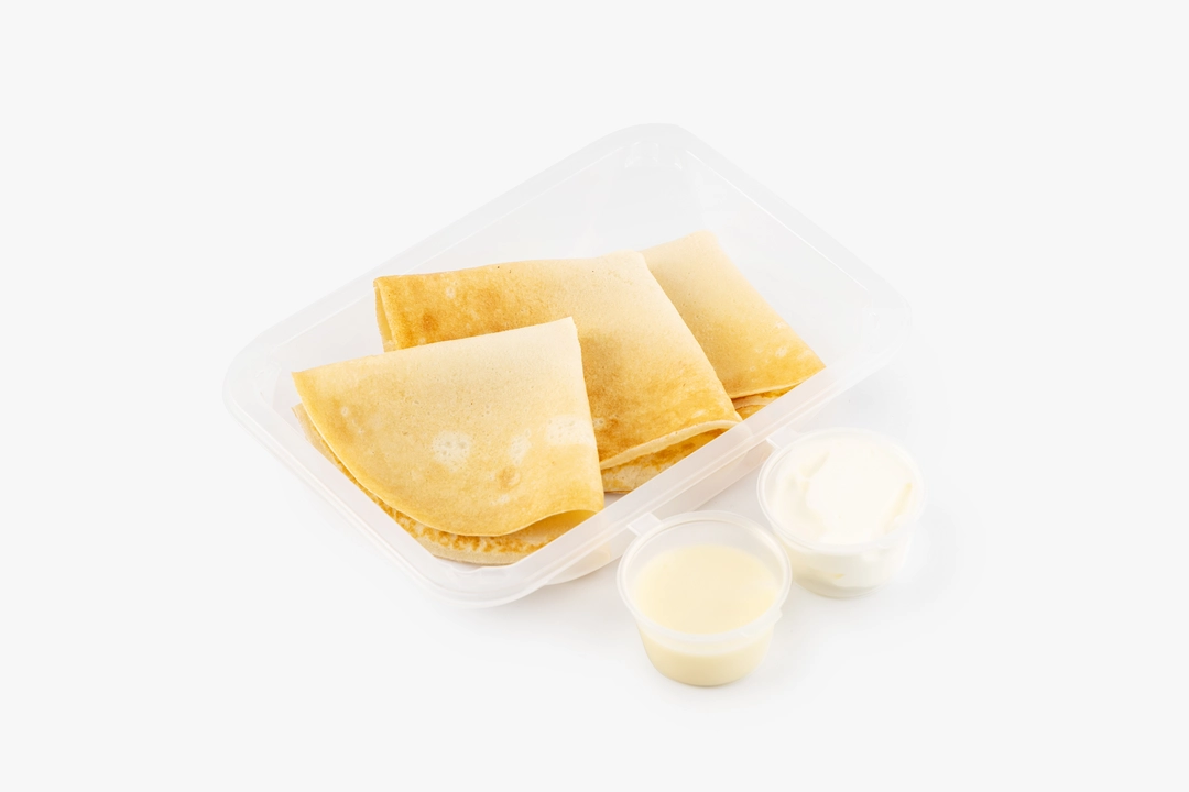 Классический сытный завтрак или полдник. Мы приготовили тесто на сливочном масле и молоке, чтобы блинчики получились тонкими, нежными и эластичными. Отдельно упаковали порции сметаны и цельного сгущённого молока, чтобы вы могли выбрать то, что вам больше по вкусу. Блюдо приедет к вам горячим и готовым к подаче на стол. Оно напомнит о любимом детском лакомстве и простой домашней кухне.