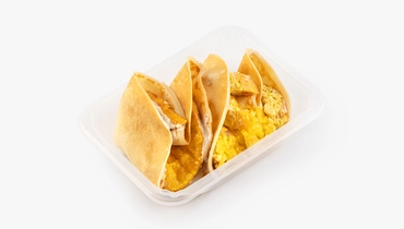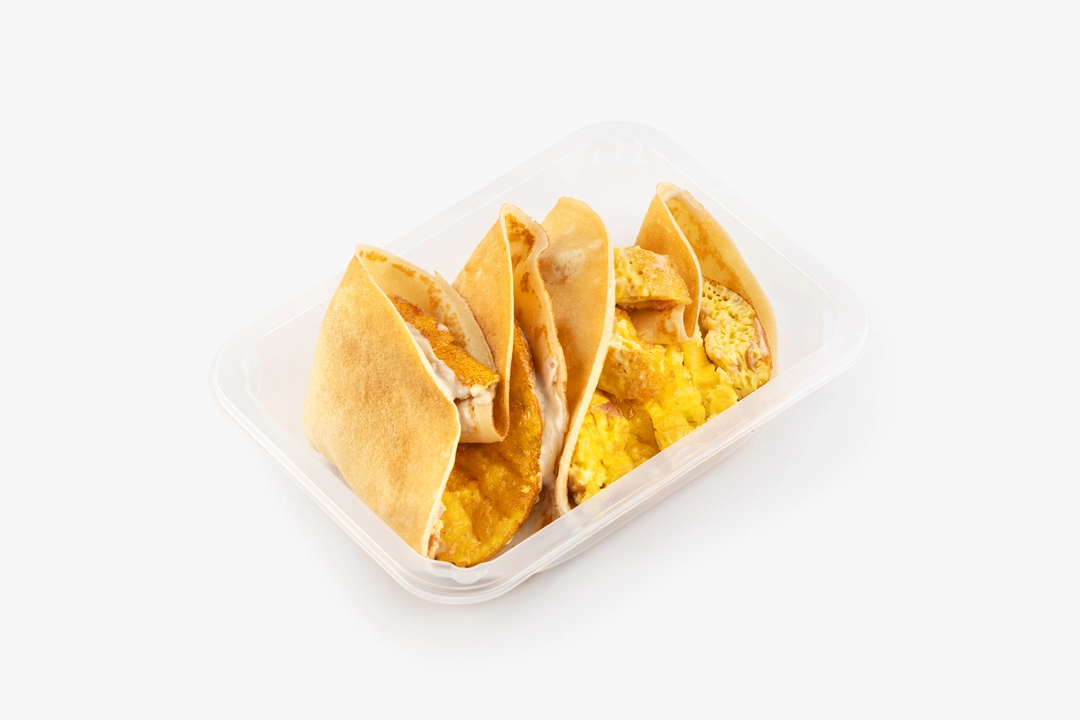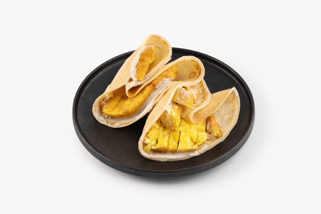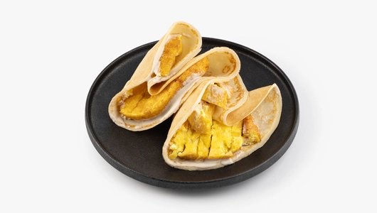 Блин сытный, достойный утреннего пиршества. Румяный да золотистый, он укрыл в себе угощение, что сил придаёт и радость несёт. Внутри блина томится омлет воздушный, словно облако над весенним полем. Рядом с ним сервелат сочный, а поверх всего сыр тёртый, что тает от тепла, превращаясь в тягучую нежность. Вкус блина мягок, да полон благородства, словно щедрость самой весенней природы.