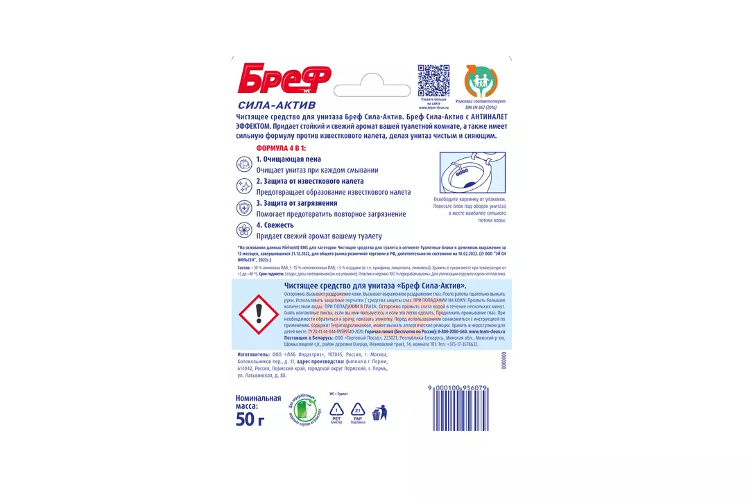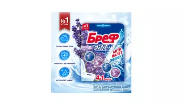 Бреф Сила-Актив с АНТИНАЛЕТ ЭФФЕКТ – подвесной туалетный блок с формулой против известкового налета. Активная формула с антиналет эффектом действует в 4 направлениях: • образует очищающую пену, которая обеспечивает гигиеническую чистоту; • предотвращает образование известкового налета; • помогает предотвратить повторное загрязнение; • придает туалетной комнате свежий аромат лаванды после каждого смывания. Бреф Сила-Актив придает антиналет эффект при каждом смывании. Производитель ООО ЛАБ Индастриз. Страна производитель-Россия
