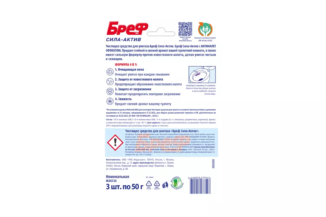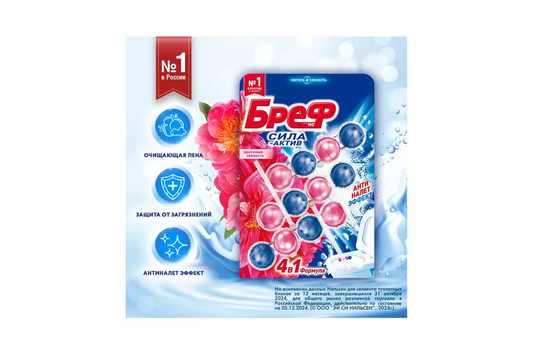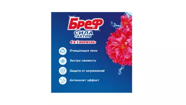 Бреф Сила-Актив с АНТИНАЛЕТ ЭФФЕКТ – подвесной туалетный блок с формулой против известкового налета. Активная формула с антиналет эффектом действует в 4 направлениях: • образует очищающую пену, которая обеспечивает гигиеническую чистоту; • предотвращает образование известкового налета; • помогает предотвратить повторное загрязнение; • придает туалетной комнате свежий цветочный аромат после каждого смывания. Бреф Сила-Актив придает антиналет эффект при каждом смывании. Производитель ООО ЛАБ Индастриз. Страна производитель-Россия