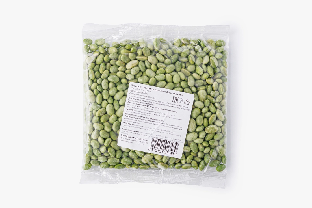 Замороженные соевые бобы эдамаме. Нежные, со сладковатым вкусом и лёгкой приятной горчинкой. Готовить такие бобы быстро и очень просто. Их можно съесть как питательное блюдо с соусом, добавить их в салат, в азиатский вок, к лапше, рису или морепродуктам.