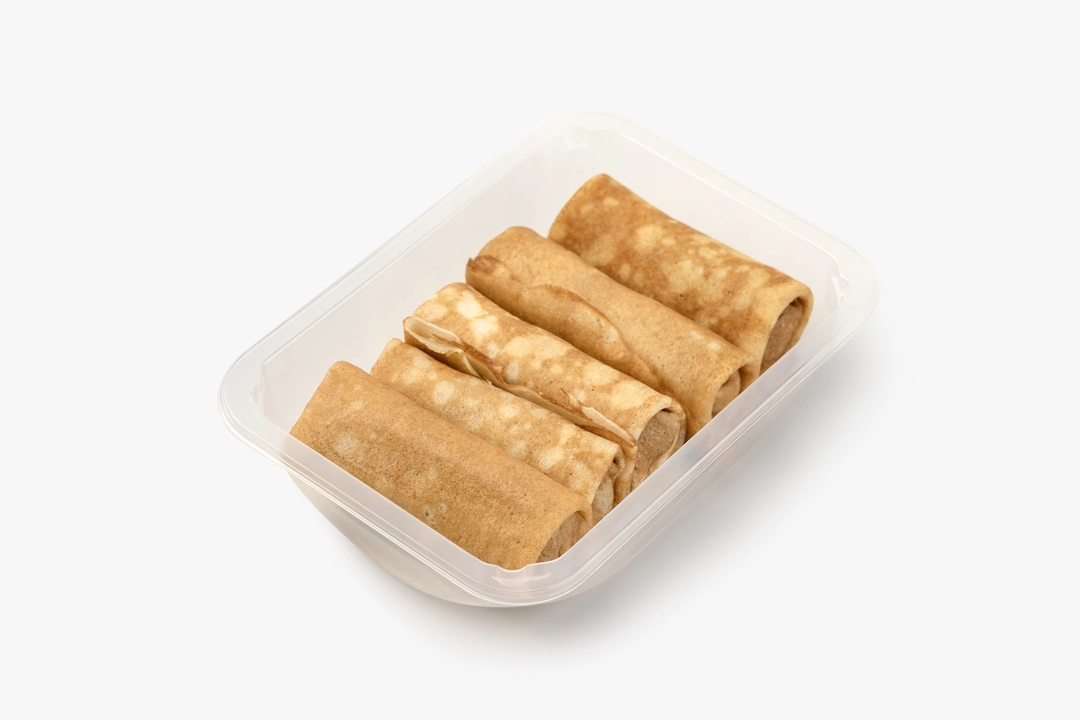 Пять румяных блинчиков с золотистой корочкой скрывают сладкую начинку из варёной сгущёнки и обжаренного арахиса. Хрустящие ядра орехов и солёные крошки кренделя создают интересный контраст с нежной сливочной текстурой сгущённого молока, а арахисовая паста усиливает ореховую ноту. Блюдо приедет горячим — можно сразу подавать к столу, чтобы насладиться сочетанием тёплых блинчиков и тягучей начинки с хрустинками.