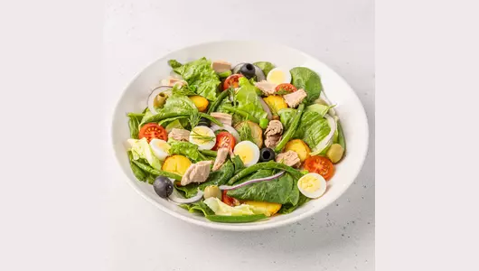 Микс салатов с тунцом, оливками каламато, перепелиными яйцами, запеченным картофелем и красным сладким луком