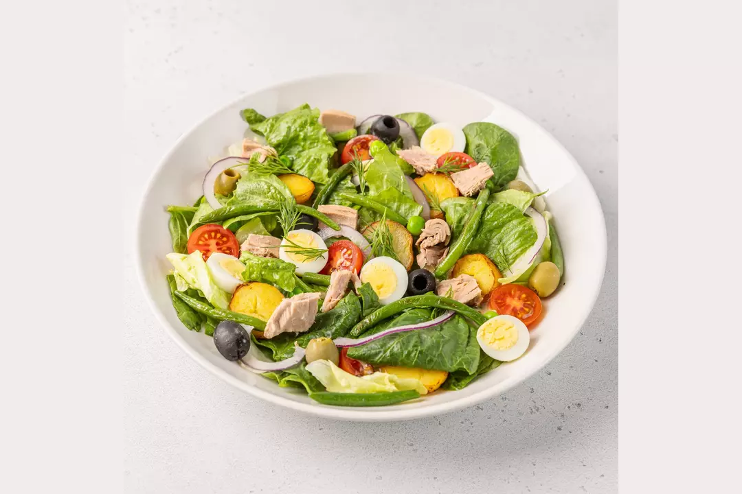 Большой салат Нисуаз с тунцом, картофелем, перепелиным яйцом, томатами, листьями салата и красным луком
