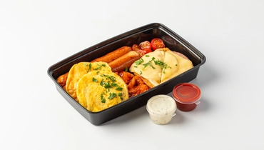 Сбалансированный завтрак, в котором есть всё, чтобы начать день с хорошего настроения. Сытные сосиски с сыром соседствуют с пышным омлетом. Картофельные вафли с луком добавляют приятный контраст текстур, с ними идеально сочетается голландский сыр и куриная ветчина. А печёная фасоль с томатами и сладким перцем придаёт блюду питательность. Добавили к завтраку два соуса — томатный с пряностями и сливочно-чесночный с укропом. А немного томатов черри и свежая петрушка вносят свежие акценты. Большой завтрак приедет горячим.