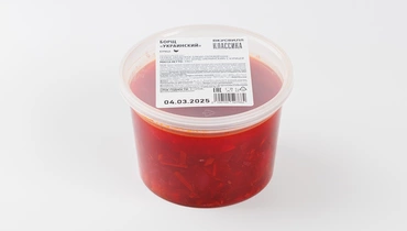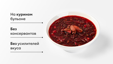 Борщ приготовлен на курином бульоне с кусочками сочного филе, свежей зеленью и натуральными специями. Без ароматизаторов, усилителей вкуса и консервантов