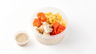 Сытный боул с простым и понятным составом — всё, что нужно для сбалансированного обеда или ужина. В основе рассыпчатый отварной рис, который дополняют нежное куриное филе с чесноком и прованскими травами, мягкий яичный скрембл и свежие овощи. Черри и сладкий перец придают блюду сочность и лёгкую сладость. Отдельно подаётся кунжутная заправка, она добавляет боулу пикантность и ореховый оттенок. Блюдо доступно для самовывоза из офлайн-точек Сгоряча и приедет к вам горячим и готовым к подаче. Его тоже можно выбрать Любимым продуктом и покупать с приятной скидкой.