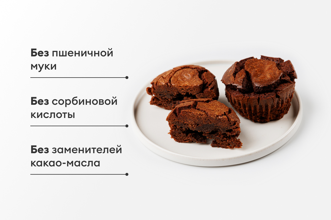 Приготовили ваш любимый брауни на смеси из рисовой и льняной муки, чтобы сделать его более лёгким и воздушным. Состав проверен: нет заменителей масла какао и сорбиновой кислоты