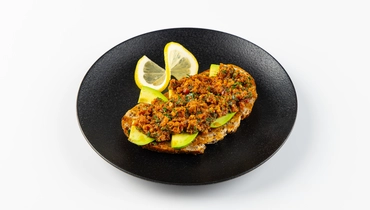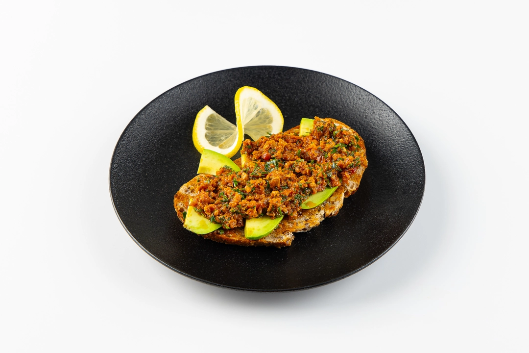 Подрумяненный ломтик зернового хлеба покрыт пастой из вяленых томатов, дроблёного кешью и ароматных трав. Под ней — дольки спелого авокадо, которые добавляют мягкость и балансируют вкус. Немного свежей зелени делает композицию ярче и насыщеннее, а ломтик лимона можно использовать, чтобы добавить лёгкую цитрусовую кислинку. Такая брускетта получается одновременно сытной и свежей, хорошо подойдёт в качесте закуски или перекуса.