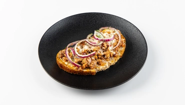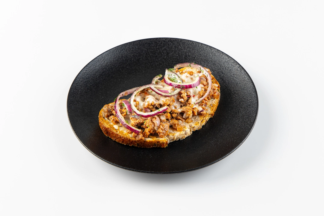 Подрумяненный ломтик зернового хлеба щедро покрыт сочной мясной начинкой. Говядина в соусе сальса даёт насыщенный вкус с лёгкой остротой, а сверху всё дополняет слой расплавленного сыра. Красный лук добавляет свежую сладковатую нотку, которая уравновешивает мясной акцент. При запекании хлеб становится хрустящим по краям, но остаётся мягким в середине, чтобы начинка хорошо держалась. Такая брускетта подойдёт для сытной закуски или в качестве альтернативы горячему бутерброду.