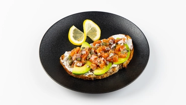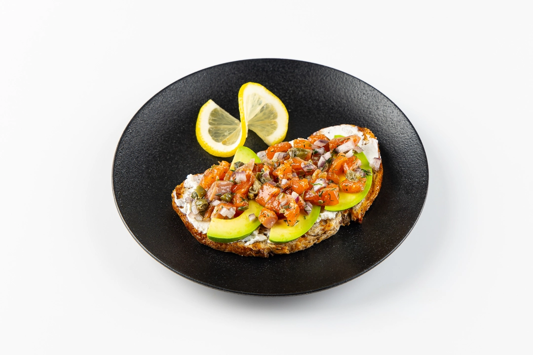 Поджаренный ломтик зернового хлеба — основа для яркой брускетты. На нём — слой нежного творожного сыра, дольки авокадо и тартар из форели с луком и каперсами. Сочетание получается контрастным: мягкий хлеб с семенами, сливочная основа, свежая рыба и пряный акцент маринованных каперсов. Ломтик лимона рядом можно использовать для лёгкой цитрусовой нотки. Такая брускетта подойдёт и как лёгкая закуска, и как полноценный завтрак.