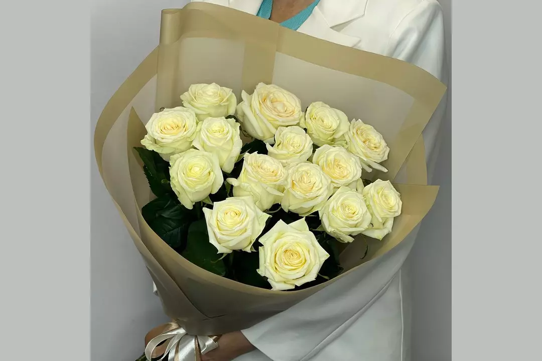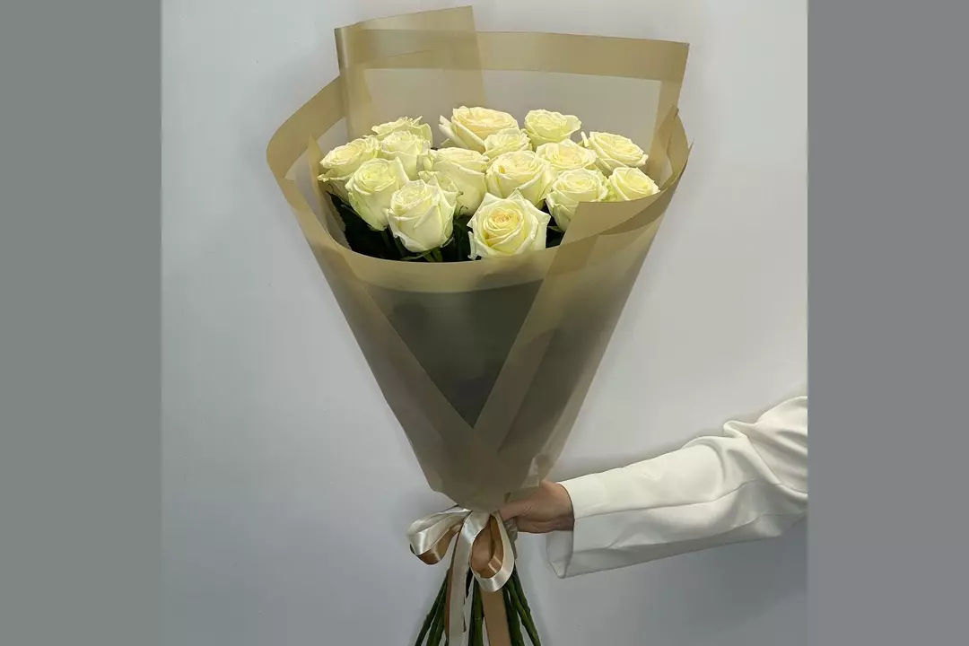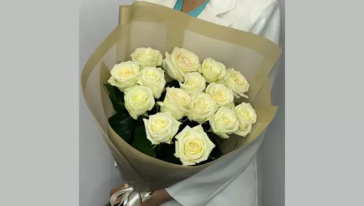 Чистота, непорочность, отсутствие злых помыслов, искренность, доверие, милосердие — все это символизируют белые розы. Состав Лента атласная - 2 шт. Упаковка фоамиран - 3 шт. роза белая premium - 15 шт.
