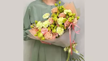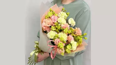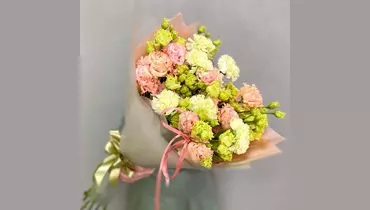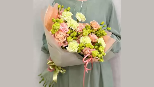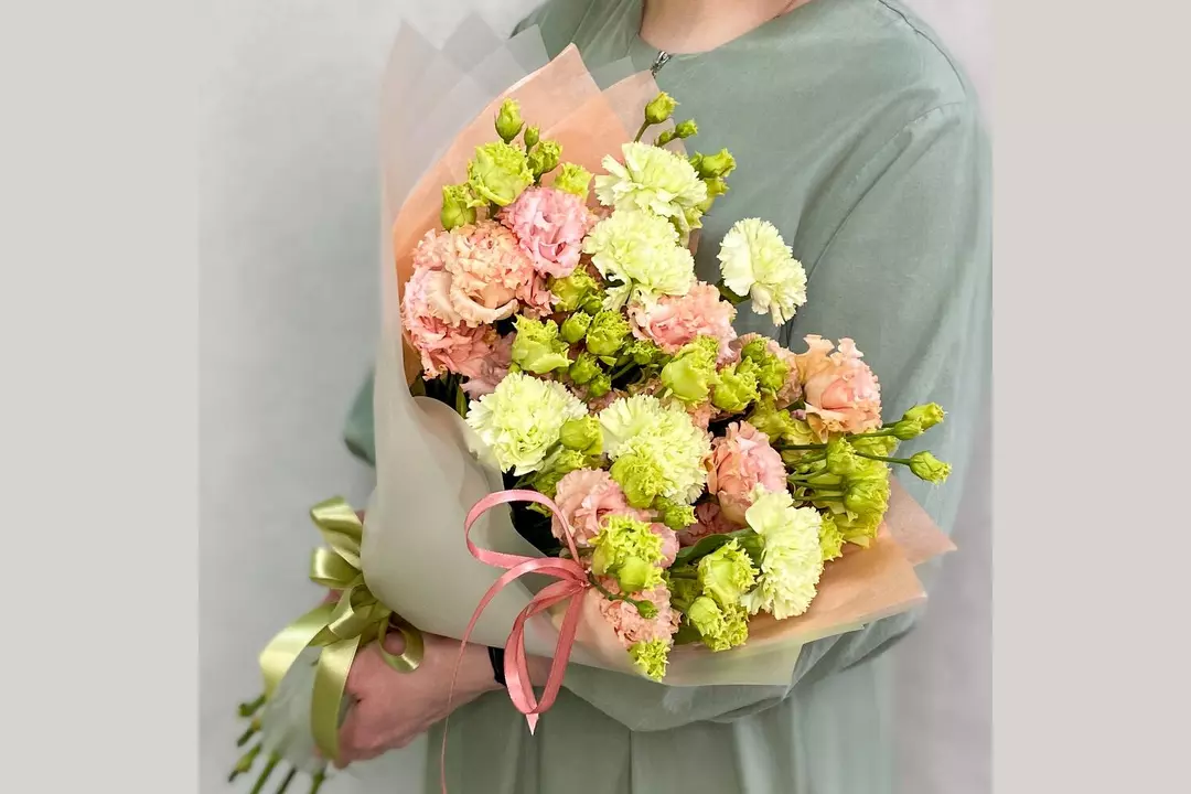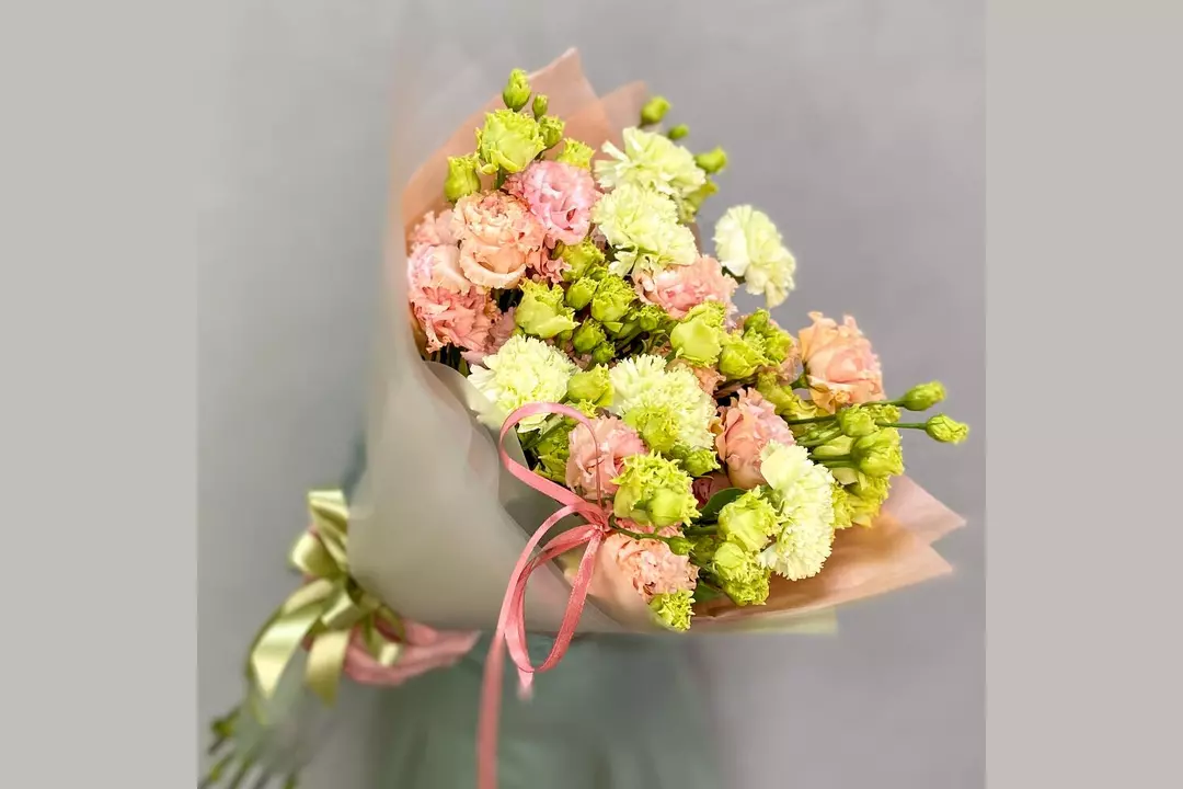 Персиковый букет из 5 эустом необычной расцветки и с 6 лаймовыми гвоздиками в стильной дизайнерской упаковке. Состав: Гвоздика - 6 шт. Эустома - 5 шт. Лента атласная - 2 шт. Упаковка дизайнерская - 1 шт.