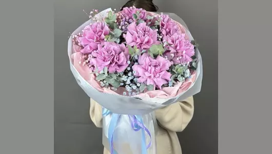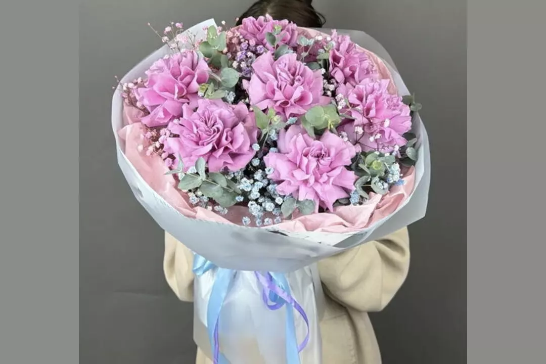 Букет ажурных роз Состав: роза пионовидная французская - 7 шт, гипсофила - 5 шт, эвкалипт - 3 шт, упаковка - 2 шт, лента - 1 шт