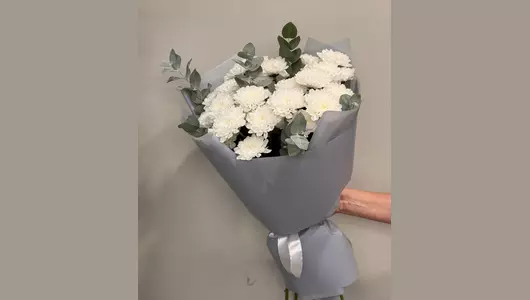 Нежный букет из белых цветов. состав - хризантема кустовая 5 шт. эвкалипт - 5 шт. упаковка 1 шт.