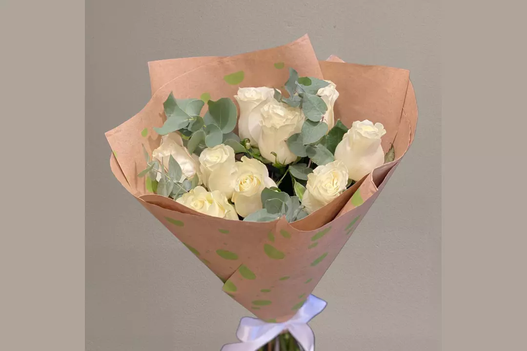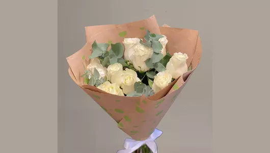 Нежный букет из Эквадорской розы . Состав-Роза белая 9 шт. Эвкалипт-пучок 1 шт