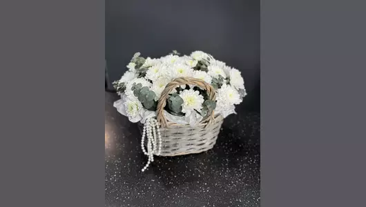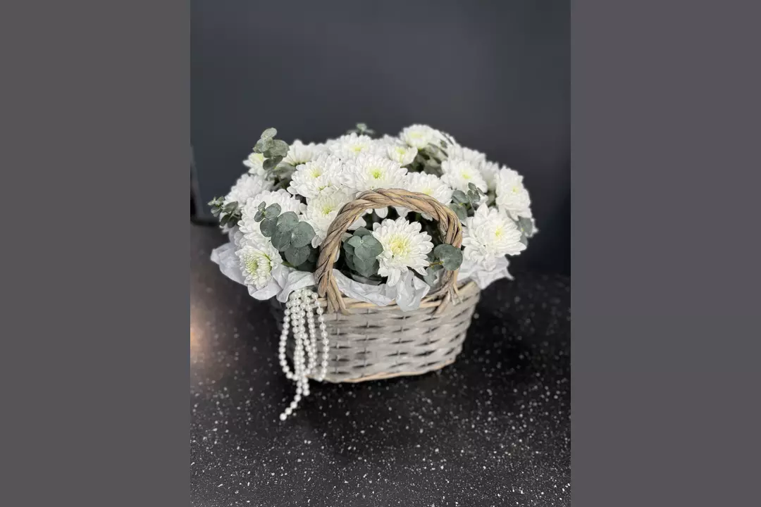Нежные и пышные соцветия хризантем символизируют искренность и чистоту намерений, а белая расцветка подчёркивает их изящество и лёгкость. В сочетании с натуральным деревом корзины букет создаёт атмосферу уюта и тепла, наполняет пространство свежестью и тонким цветочным ароматом. Корзина не требует вазы, что удобно, особенно если вручение происходит вне дома — в офисе, больнице, на мероприятии