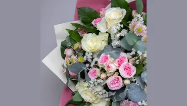 Рецепт нашего флористического букета «Бизнеследи L»: - центром нашей композиции представляем премиальную розу «Мондиал» - задаём мягкую розовую тональность пышной кустовой розой - разбавляем миниатюрной хризантемой - придаём лёгкость изящной альстромерией и белоснежной статицей - приправляем ветками эвкалипта и листьями салал - заворачиваем в бумагу в тон букета и завязываем шелковой лентой. - ставим в воду с кризалом - отправляем в холодильную камеру Вуаля! Исключительный букет «Бизнеследи L» готов к отправке покупателю! Мы рады предложить удобную недорогую доставку по Москве и в любой момент создать Вам праздничное настроение. К сожалению, мы не можем гарантировать точную копию букета. Наши цветы могут отличаться от указанных на фотографии, ведь они приезжают к нам из разных уголков мира. В свою очередь, мы гарантируем соблюдение стиля и основного состава букета, в этом можете быть уверенными.