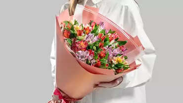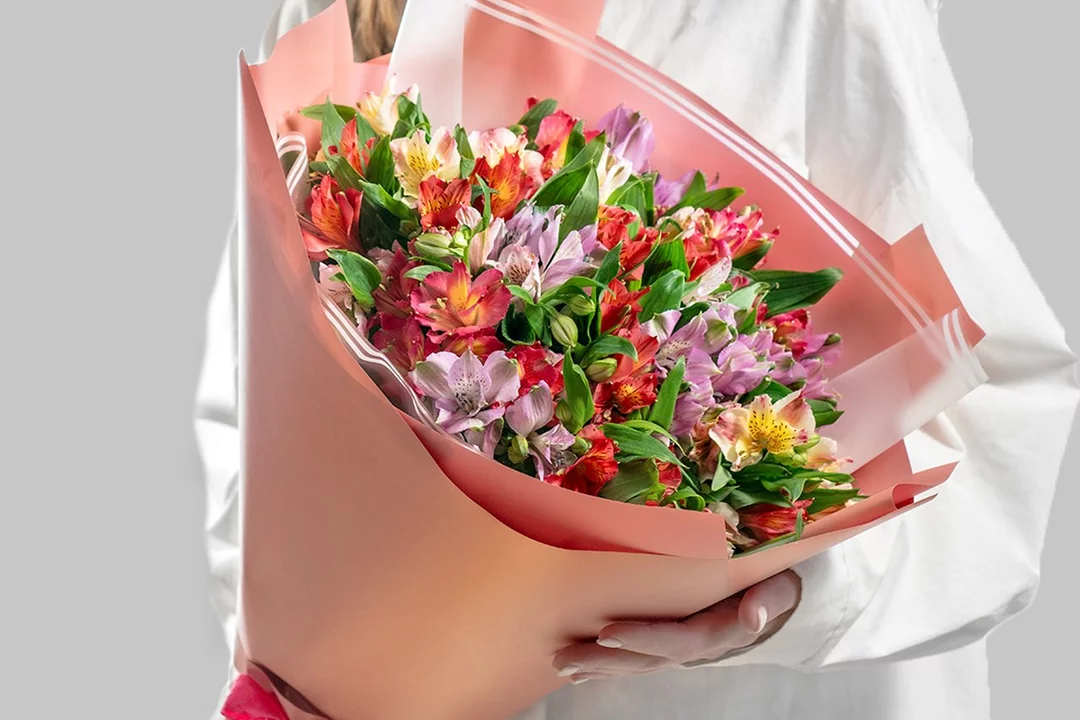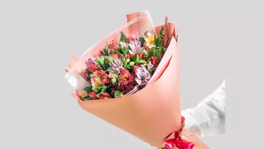 Состав: альстромерия - 15шт, пленка - 2шт, лента - 1шт