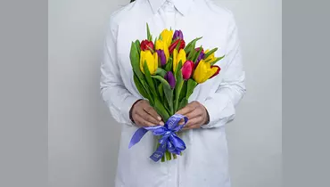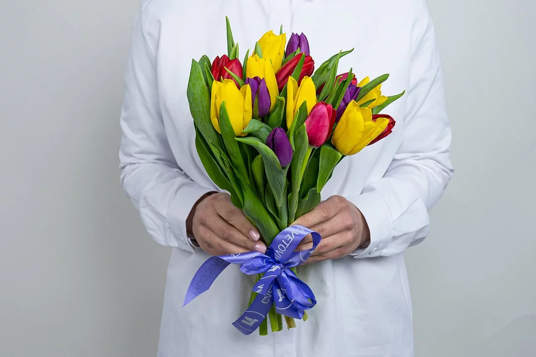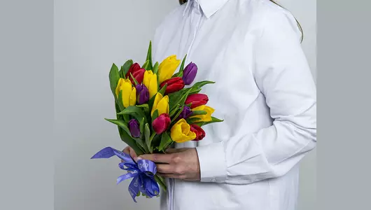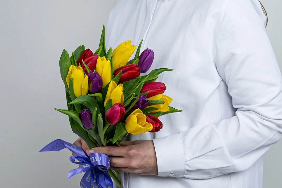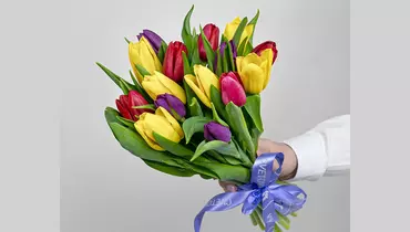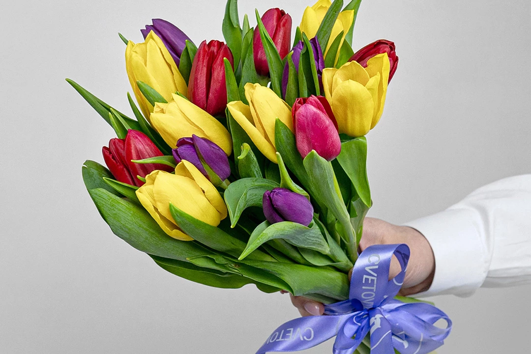 Букет из 15 тюльпанов микс стандарт под ленту