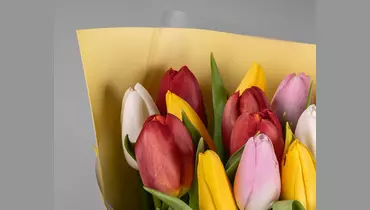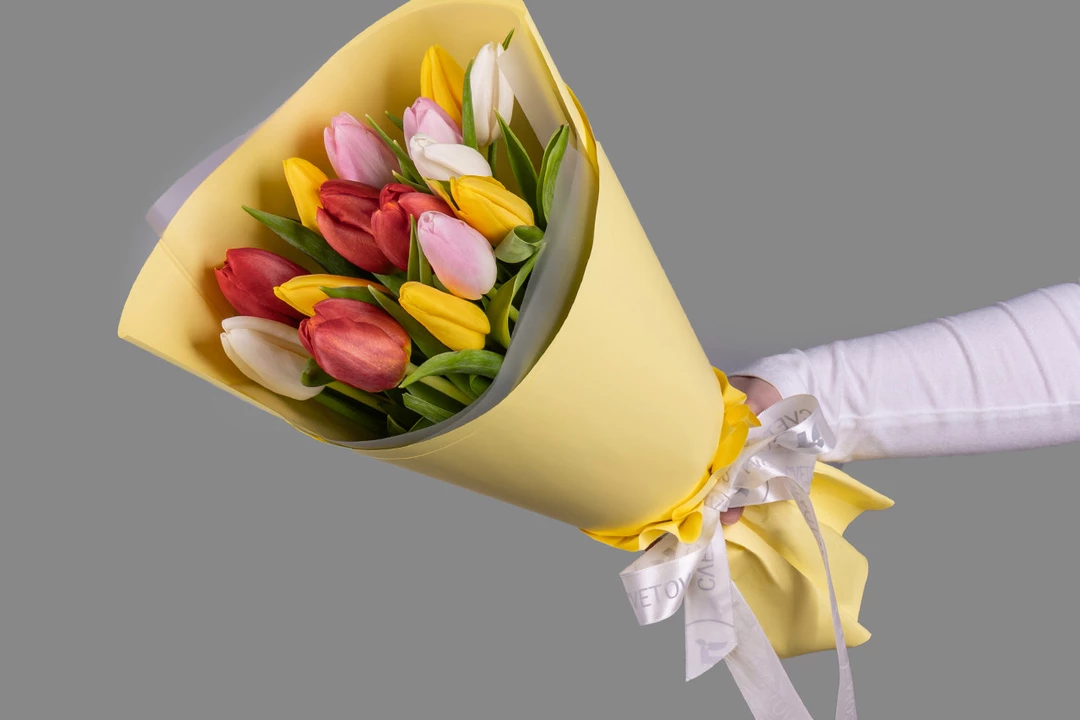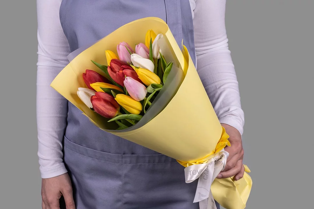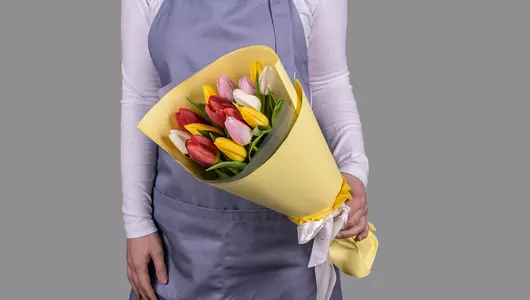 Букет из 15 тюльпанов микс стандарт в оформлении