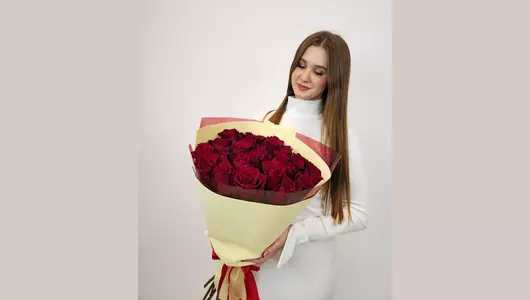 Букет из 25 бордовых роз в дизайнерской упаковке