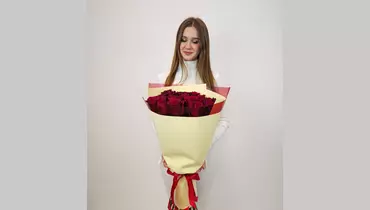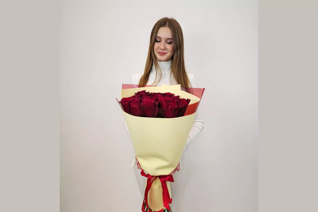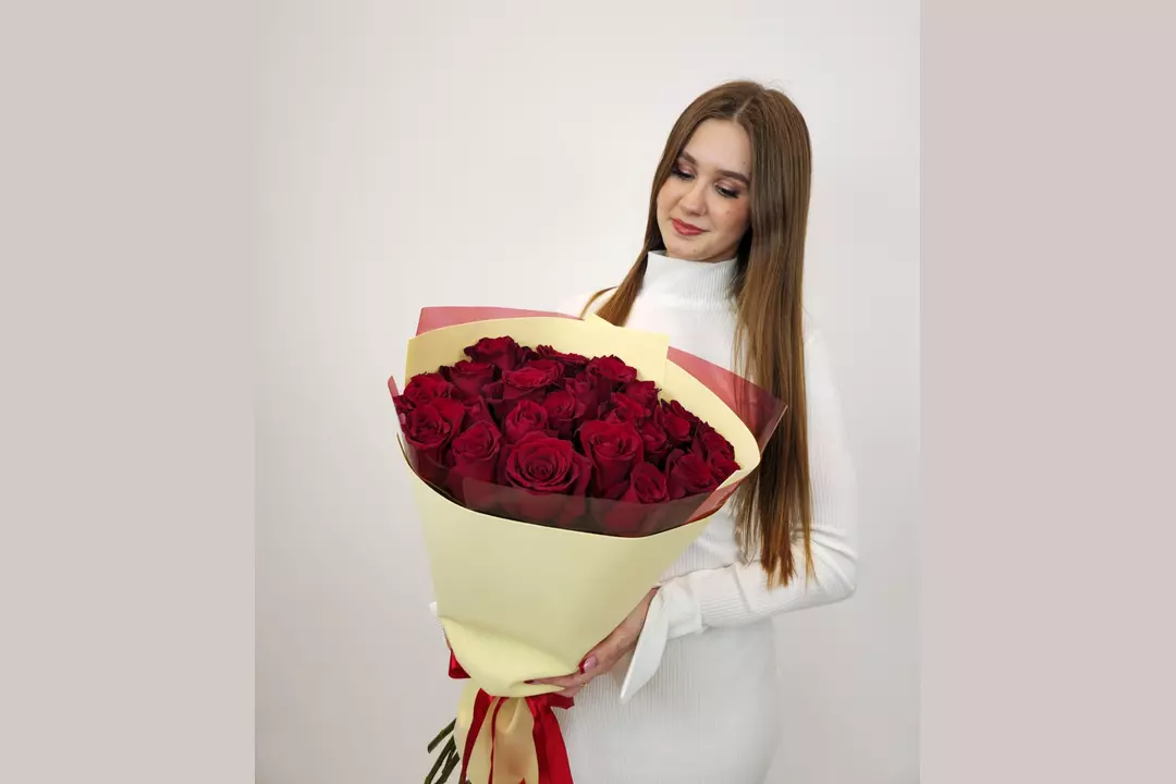 Букет из 25 бордовых роз в дизайнерской упаковке Состав: роза 80 см - 25 шт флористическая упаковка, лента