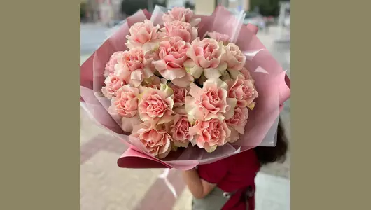 Букет из 25 французских, розовых роз в матовой плёнке FMART by flowwow