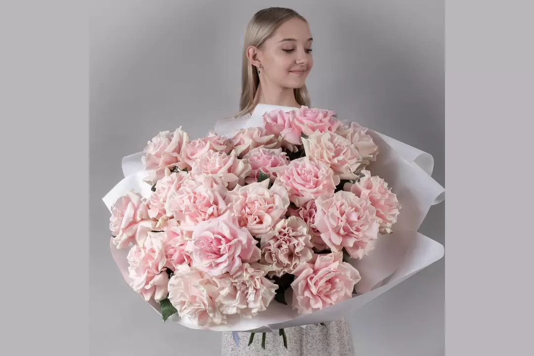 Состав Упаковка дизайнерская - 6 шт. Французская роза - 25 шт. Размер Ширина - 45 см Высота - 55 см Букет из 25 розовых французских роз — элегантная композиция, которая подойдёт для романтического подарка, дня рождения или другого торжественного события. Французские розы с их пышными бутонами и вывернутыми лепестками создают эффект воздушности, а розовый оттенок символизирует нежность, любовь и восхищение.