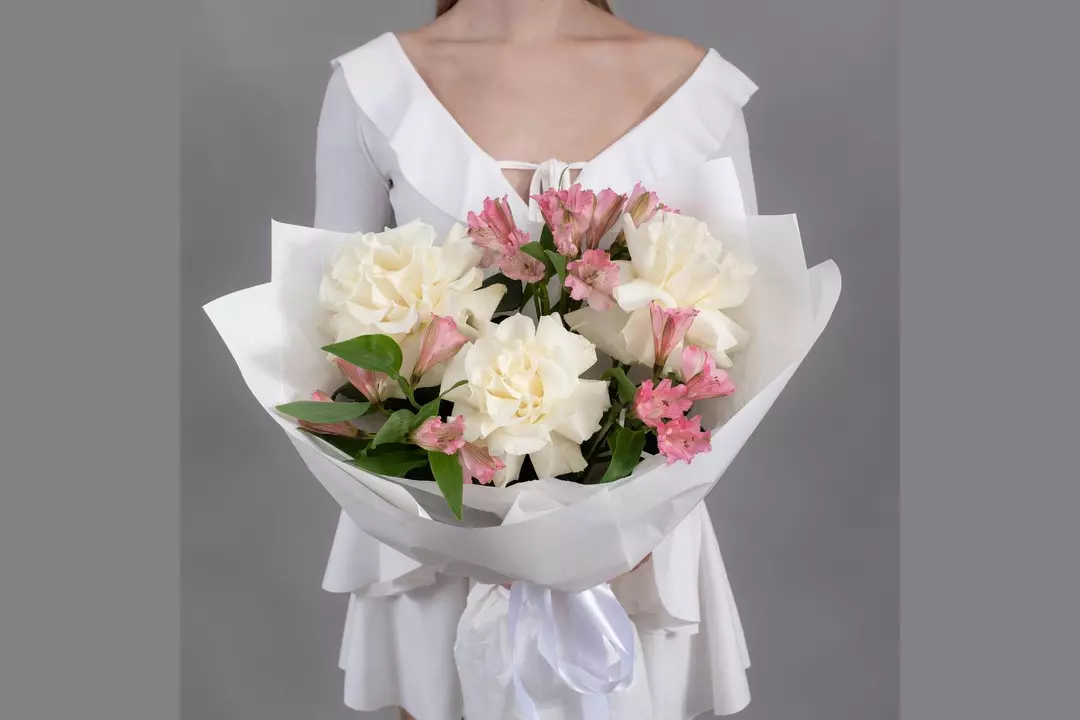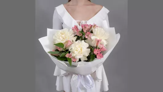Букет из 3 белых, французских роз и 4 розовых альстромерий FMART by flowwow