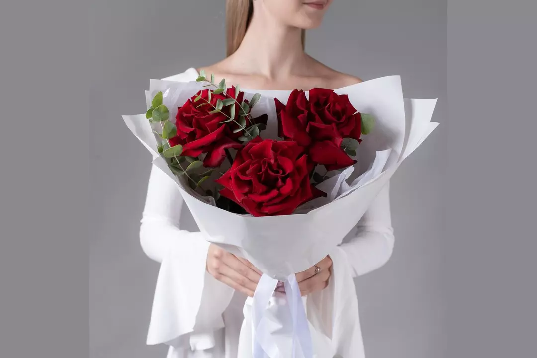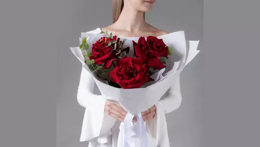 Букет из 3 бордовых, французских роз с эвкалиптом FMART by flowwow