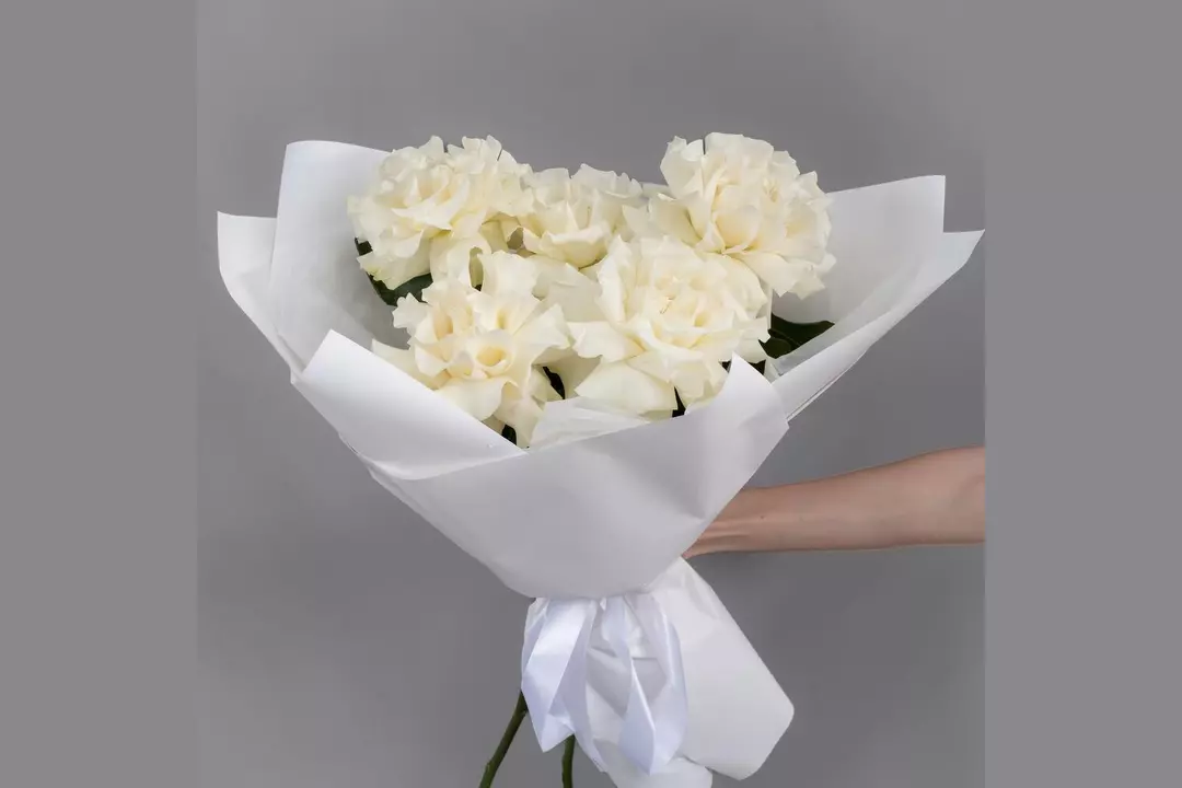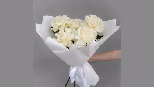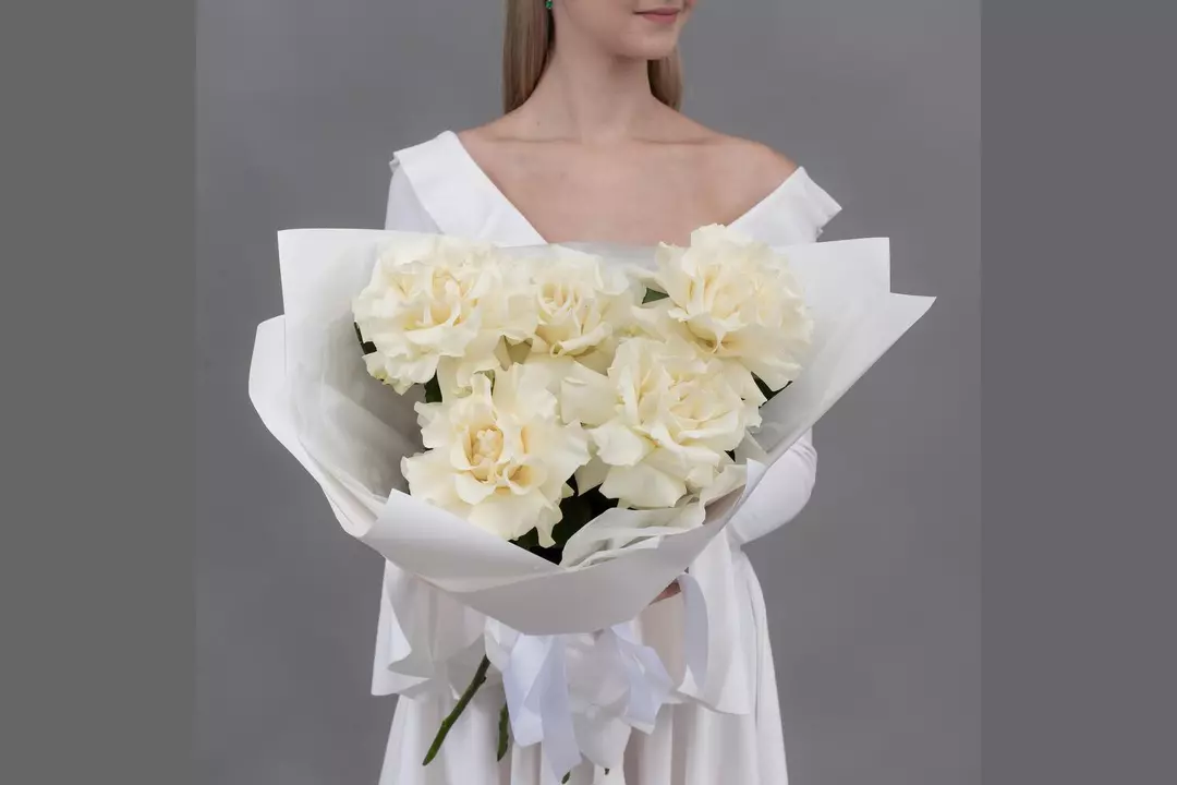 Состав Упаковка дизайнерская - 5 шт. Французская роза - 5 шт. Размер Ширина - 30 см Высота - 55 см Белый цвет роз ассоциируется с чистотой, невинностью и новой любовью. Пять роз в букете символизируют любовь, уважение и восхищение. Французские розы отличаются крупными бутонами и бархатистыми лепестками.