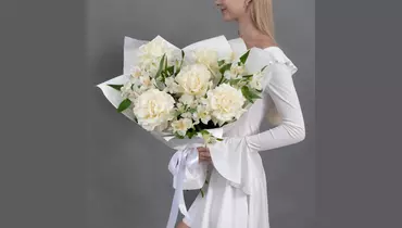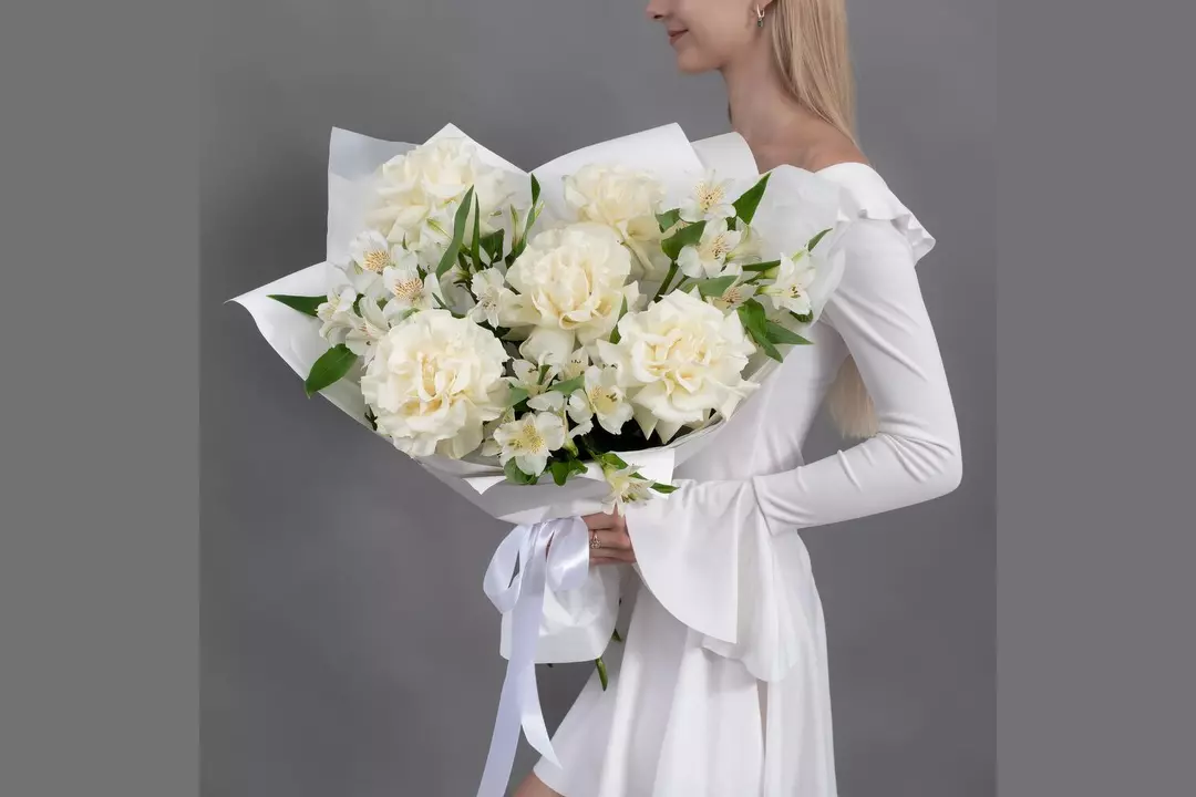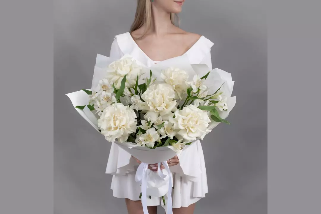 Букет из 5 белых, французских роз и 4 белых альстромерий FMART by flowwow