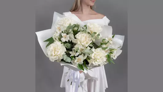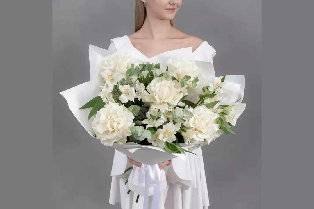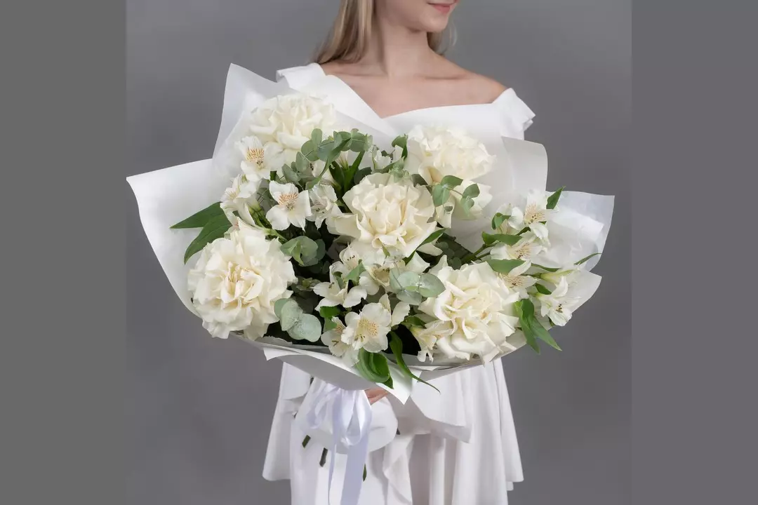 Букет из 5 белых, французских роз и 4 белых альстромерий с эвкалиптом FMART by flowwow