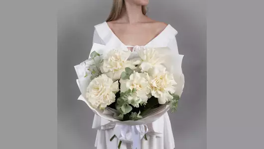 Состав Эвкалипт - 3 шт. Упаковка дизайнерская - 5 шт. Французская роза - 5 шт. Размер Ширина - 30 см Высота - 55 см Букет из 5 белых французских роз с эвкалиптом — элегантная композиция, которая сочетает изысканность и природную свежесть. Французские розы придают букету благородство, а эвкалипт добавляет объёма и текстуры.