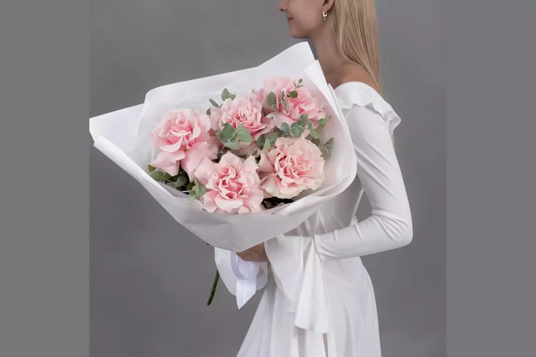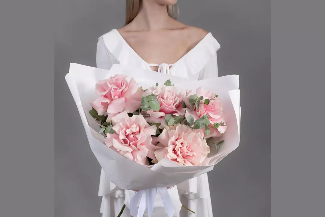 Букет из 5 розовых, французских роз с эвкалиптом FMART by flowwow