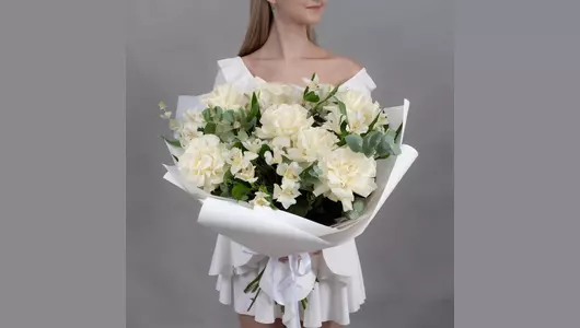 Состав Альстромерия - 6 шт. Эвкалипт - 4 шт. Упаковка дизайнерская - 6 шт. Французская роза - 7 шт. Размер Ширина - 35 см Высота - 55 см Букет из 7 белых французских роз, 6 белых альстромерий и эвкалипта — элегантная композиция, которая подойдёт для выражения нежности, благодарности или поздравления с особым событием. Французские розы добавляют роскоши, альстромерии вносят лёгкость и объём, а эвкалипт придаёт свежесть и текстуру.