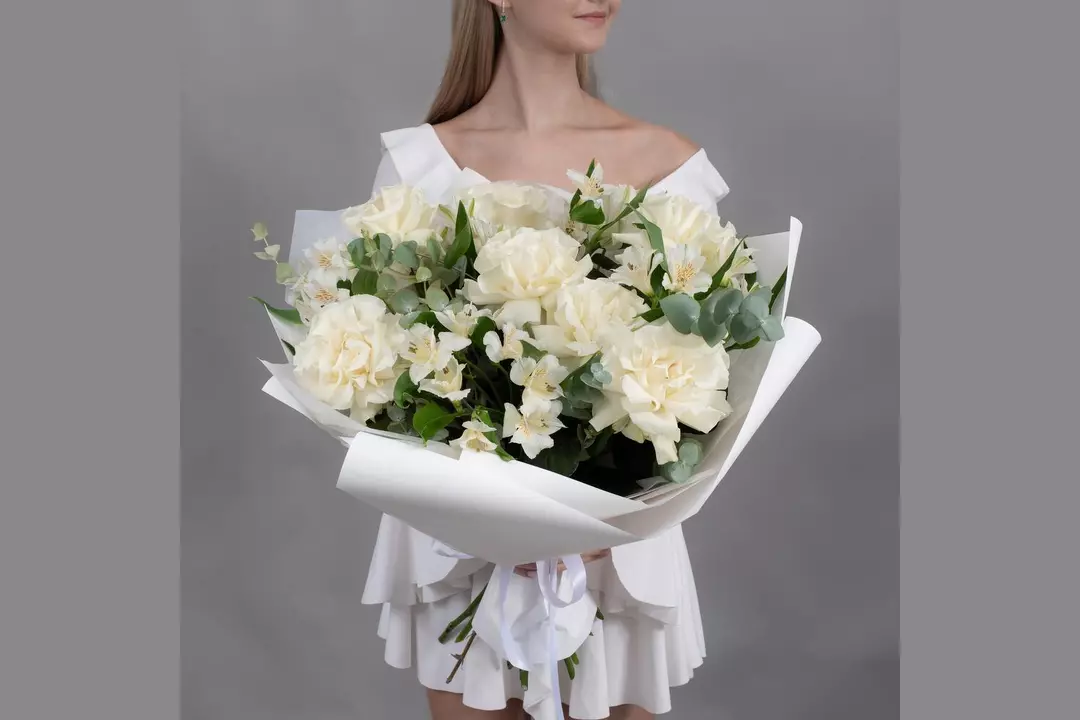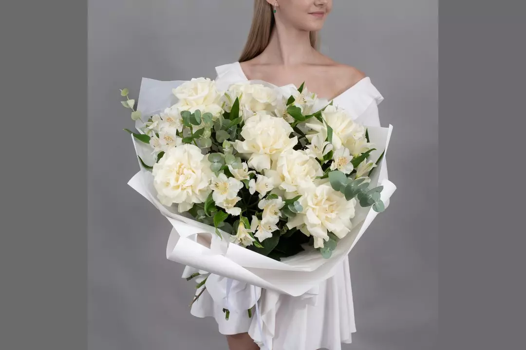 Букет из 7 белых, французских роз и 6 белых альстромерий с эвкалиптом FMART by flowwow