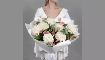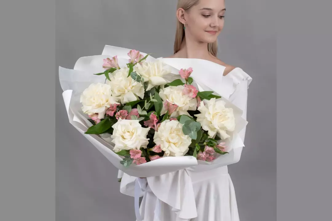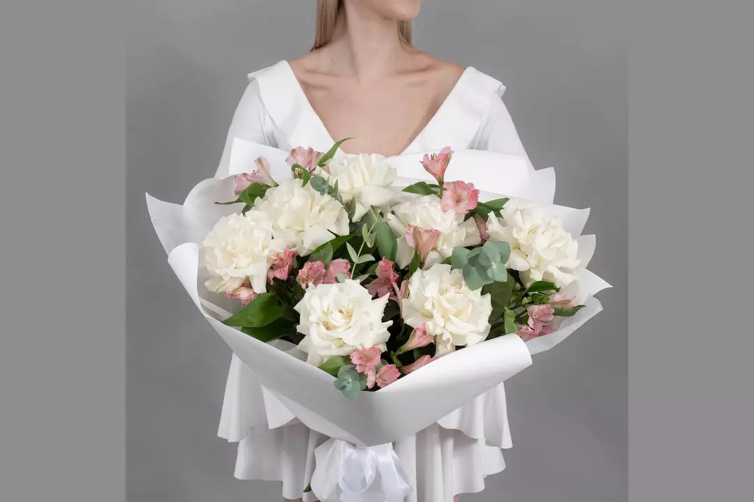 Состав Альстромерия - 6 шт. Эвкалипт - 4 шт. Упаковка дизайнерская - 6 шт. Французская роза - 7 шт. Размер Ширина - 35 см Высота - 55 см Букет из 7 белых французских роз, 6 розовых альстромерий и эвкалипта — это элегантная композиция, сочетающая нежность и объём. Французские розы с их пышными бутонами и бархатистыми лепестками гармонично дополняются изящными альстромериями и свежей зеленью эвкалипта.